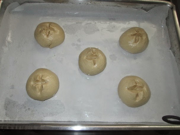 7. Den Teig in 8 gleiche Stücke teilen und jeweils zu einer glatten Kugel formen, dann leicht abflachen. Legen Sie sie auf leicht gefettete oder mit Pergament ausgekleidete Backbleche.Sprühen oder leicht mit Öl bestreichen, locker abdecken und den Teig noch 30 Minuten gehen lassen. Bürsten Sie mit Eierwäsche (oder etwas anderem, das sicherstellt, dass der Belag beim Backen haftet) und schneiden Sie dann mit einer scharfen Klinge oder Schere Schlitze (wie a +) oben ab