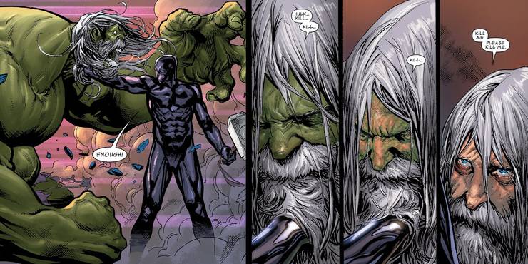 efter en evighed af tortur vinder Marvels HULK endelig dødens fred… men ikke hvordan man kunne forvente. Bruce banners udødelighed blev en forbandelse på siderne i Thanos-tegneserien, hvor superskurken blev trukket ind i fremtiden for Marvels tidslinje. Nå, teknisk set den virtuelle ende af tidslinjen, når den gamle konge Thanos forbliver det eneste sapient væsen i universet, har han ikke dræbt eller slået.