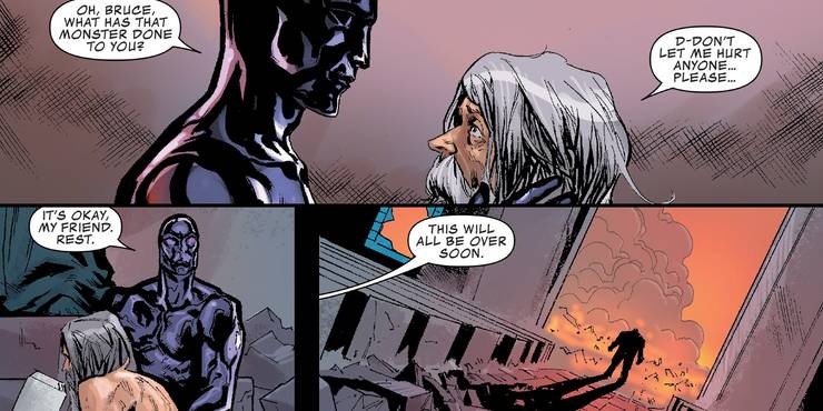 så når Silver Surfer ankommer som den sidste Thor, der er værdig til hammeren Mjolnir, og søger at ødelægge Thanos for at ødelægge universet, Hulk er både billedligt og bogstaveligt “frigivet.”Ved første miste sin raseri på Silver Surfer, der viser, at den mand, der engang havde været Bruce Banner var tabt til raseri af Hulk. Heldigvis for ham husker Norrin Radd stadig den heroiske version af Hulk selv efter tusinder af års mellemrum. Og i filmene som i tegneserierne er en rolig påmindelse om den ven, der stadig lever inde i Hulken, hvad der er nødvendigt for at bringe Banner tilbage.